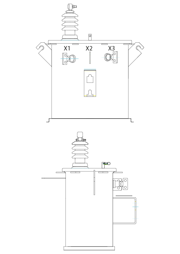O arranjo dos componentes e dimensional destes equipamentos seguem a padronização da NBR-5440 em sua versão vigente, entretanto na tabela abaixo podem ser obtidas as dimensões externas / arranjo geral e massa para estes tipos de transformadores:
